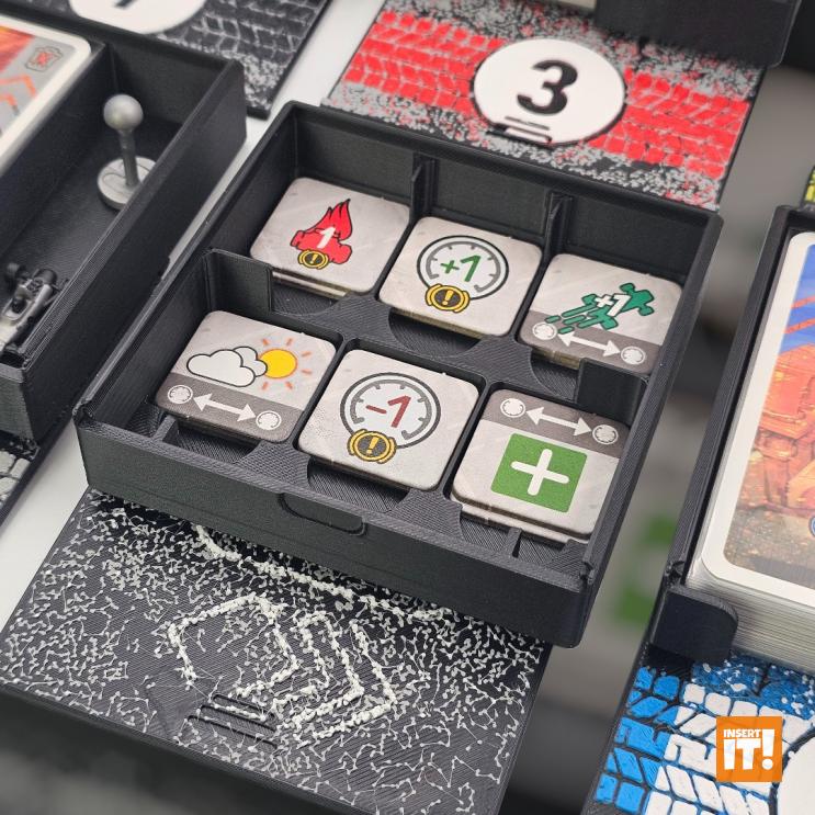 Minden társasjáték rendezőnk a 3D nyomtatásban igencsak bevált, PETG nevű anyagból készül. A PETG rendkívül erős és ütésálló, miközben kiváló hő- és vegyi ellenállással bír. Rugalmas jellege és alacsony zsugorodása miatt ideális funkcionális és tartós alkatrészekhez, mint amilyenek a társasjáték rendezők. A PETG ellenáll az oldószereknek, olajoknak és más vegyszereknek (míg pl. a PLA hajlamos lebomlani bizonyos anyagokkal való érintkezés során). A PETG-vel nyomtatott tárgyak stabilabbak maradnak párás környezetben. A PET (polietilén-tereftalát) ismerős lehet bárkinek, gyakran használt műanyag, például üdítős palackok anyagaként, de 3D nyomtatásra kevésbé alkalmas. A PETG (polietilén-tereftalát-glikol) tartalmaz még glikolt, ami stabilizálja a PET-et, ami csökkenti az anyag ridegségét. Ennek eredményeként a PETG rugalmasabb, és kevésbé hajlamos a repedezésre vagy törésre, ami ideálisabbá teszi 3D nyomtatáshoz, mint a sima PET-et. Energiatakarékosabban lehet nyomtatni is vele, a PETG nyomtatásához ugyanis alacsonyabb hőmérséklet szükséges.