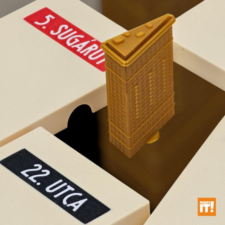 Minden társasjáték rendezőnk a 3D nyomtatásban igencsak bevált, PETG nevű anyagból készül. A PETG rendkívül erős és ütésálló, miközben kiváló hő- és vegyi ellenállással bír. Rugalmas jellege és alacsony zsugorodása miatt ideális funkcionális és tartós alkatrészekhez, mint amilyenek a társasjáték rendezők. A PETG ellenáll az oldószereknek, olajoknak és más vegyszereknek (míg pl. a PLA hajlamos lebomlani bizonyos anyagokkal való érintkezés során). A PETG-vel nyomtatott tárgyak stabilabbak maradnak párás környezetben. A PET (polietilén-tereftalát) ismerős lehet bárkinek, gyakran használt műanyag, például üdítős palackok anyagaként, de 3D nyomtatásra kevésbé alkalmas. A PETG (polietilén-tereftalát-glikol) tartalmaz még glikolt, ami stabilizálja a PET-et, ami csökkenti az anyag ridegségét. Ennek eredményeként a PETG rugalmasabb, és kevésbé hajlamos a repedezésre vagy törésre, ami ideálisabbá teszi 3D nyomtatáshoz, mint a sima PET-et. Energiatakarékosabban lehet nyomtatni is vele, a PETG nyomtatásához ugyanis alacsonyabb hőmérséklet szükséges.