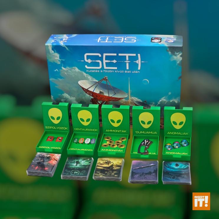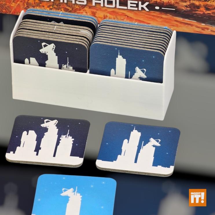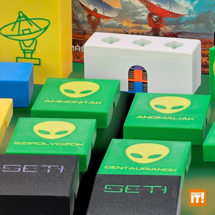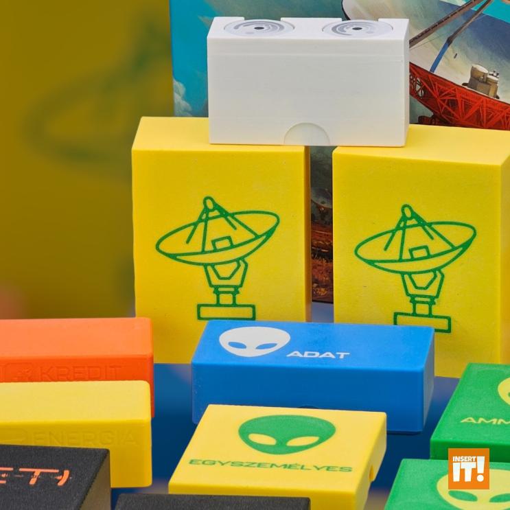Minden társasjáték rendezőnk a 3D nyomtatásban igencsak bevált, PETG nevű anyagból készül. A PETG rendkívül erős és ütésálló, miközben kiváló hő- és vegyi ellenállással bír. Rugalmas jellege és alacsony zsugorodása miatt ideális funkcionális és tartós alkatrészekhez, mint amilyenek a társasjáték rendezők. A PETG ellenáll az oldószereknek, olajoknak és más vegyszereknek (míg pl. a PLA hajlamos lebomlani bizonyos anyagokkal való érintkezés során). A PETG-vel nyomtatott tárgyak stabilabbak maradnak párás környezetben. A PET (polietilén-tereftalát) ismerős lehet bárkinek, gyakran használt műanyag, például üdítős palackok anyagaként, de 3D nyomtatásra kevésbé alkalmas. A PETG (polietilén-tereftalát-glikol) tartalmaz még glikolt, ami stabilizálja a PET-et, ami csökkenti az anyag ridegségét. Ennek eredményeként a PETG rugalmasabb, és kevésbé hajlamos a repedezésre vagy törésre, ami ideálisabbá teszi 3D nyomtatáshoz, mint a sima PET-et. Energiatakarékosabban lehet nyomtatni is vele, a PETG nyomtatásához ugyanis alacsonyabb hőmérséklet szükséges.
