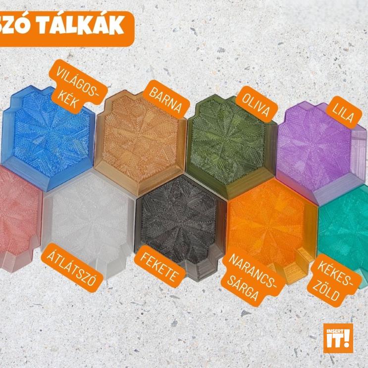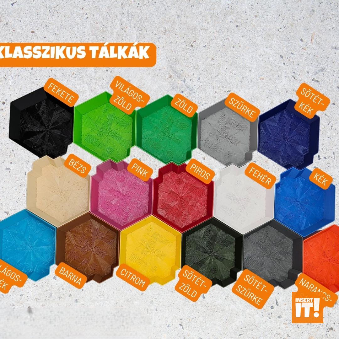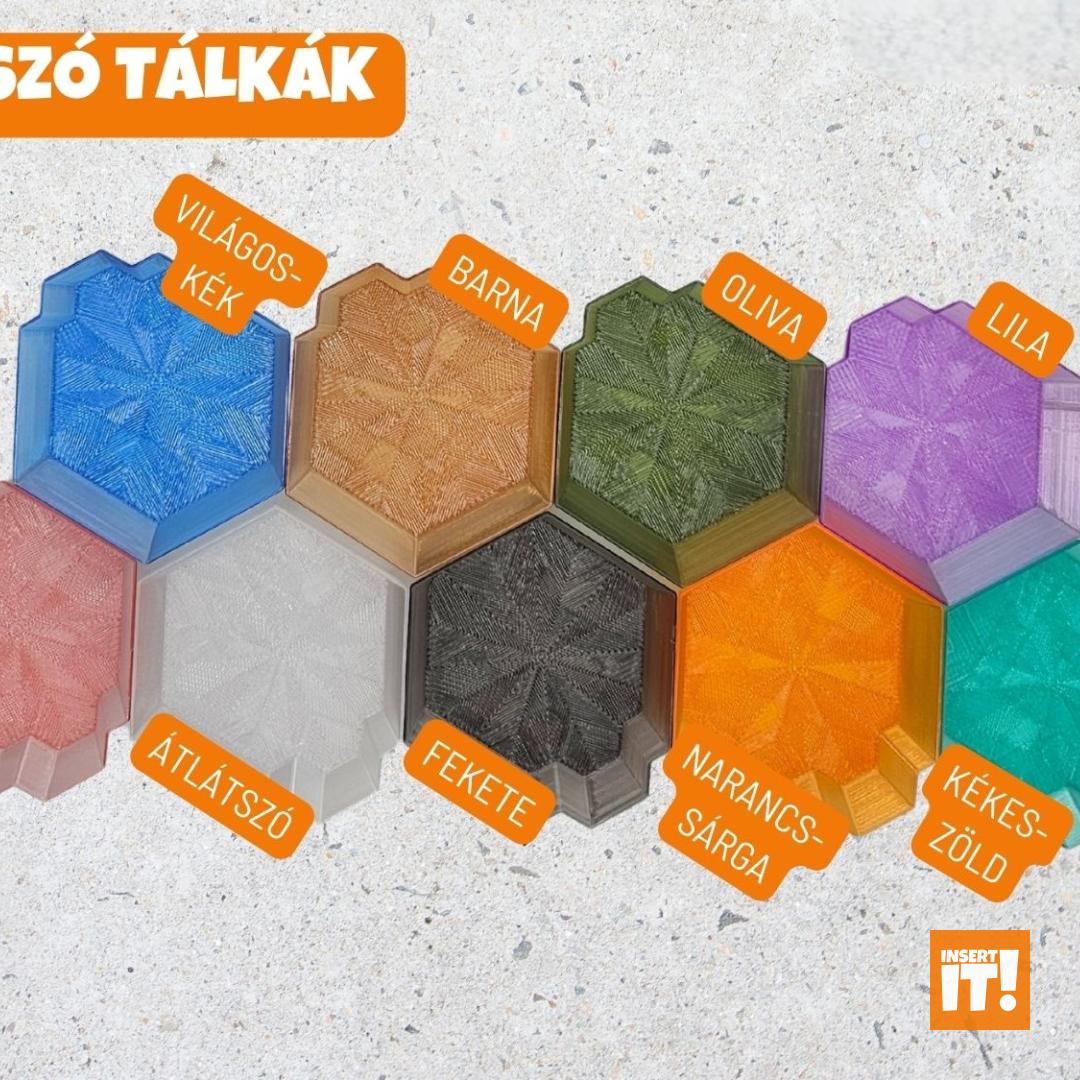 Minden társasjáték kiegészítőnk a 3D nyomtatásban igencsak bevált, PETG nevű anyagból készül. A PETG rendkívül erős és ütésálló, miközben kiváló hő- és vegyi ellenállással bír. Rugalmas jellege és alacsony zsugorodása miatt ideális funkcionális és tartós alkatrészekhez, mint amilyenek a társasjáték kiegészítők. A PETG ellenáll az oldószereknek, olajoknak és más vegyszereknek (míg pl. a PLA hajlamos lebomlani bizonyos anyagokkal való érintkezés során). A PETG-vel nyomtatott tárgyak stabilabbak maradnak párás környezetben. A PET (polietilén-tereftalát) ismerős lehet bárkinek, gyakran használt műanyag, például üdítős palackok anyagaként, de 3D nyomtatásra kevésbé alkalmas. A PETG (polietilén-tereftalát-glikol) tartalmaz még glikolt, ami stabilizálja a PET-et, ami csökkenti az anyag ridegségét. Ennek eredményeként a PETG rugalmasabb, és kevésbé hajlamos a repedezésre vagy törésre, ami ideálisabbá teszi 3D nyomtatáshoz, mint a sima PET-et. Energiatakarékosabban lehet nyomtatni is vele, a PETG nyomtatásához ugyanis alacsonyabb hőmérséklet szükséges.